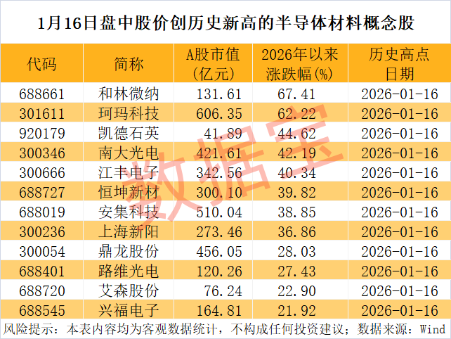 证券时报·数据宝统计,截至1月16日收盘,半导体材料概念股今年以来平均上涨21.15%,大幅跑赢同期上证指数、创业板指、科创50指数等。